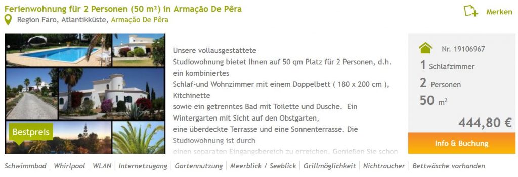 Das hat sich inzwischen glücklicherweise geändert und mit BestFewo gibt es eine Plattform mit einer großen Auswahl an Ferienunterkünften in Deutschland und Europa. BestFewo positioniert sich zwar selbst eher als Anbieter von Unterkünften in Deutschland, aber tatsächlich ist das Angebot noch viel größer. Wir haben kurzerhand schon einmal nach einer Unterkunft in Portugal an der Algarve gesucht und eine Ferienwohnung gefunden, die uns richtig gut gefällt:
