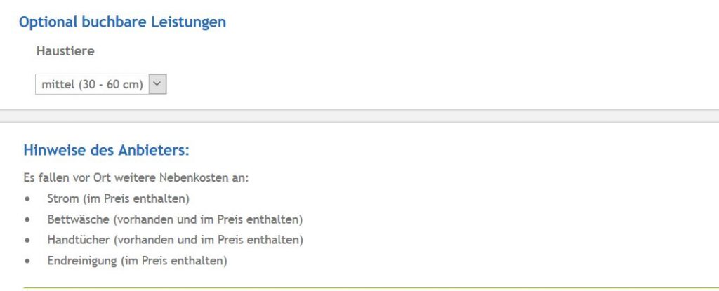 Die Suche und die Sortierfunktion laufen einwandfrei und alle Unterkünfte sind, sofern an Euren Wunschdaten verfügbar, sofort buchbar. Während des Buchungsgprozesses sieht man auch sofort welche Zahlungsmöglichkeiten es gibt, ob man Haustiere mitbringen darf (für uns ist das nicht relevant, da unsere Katzen uns den Kopf abreißen würden, wenn wir sie woanders hinbringen würden; sie bleiben während unserer Reisen immer in unserer Wohnung und werden hier versorgt. Aber für Menschen mit Hund ist das super wichtig zu wissen) und mit welchen Zusatzkosten man rechnen muss. Insgesamt ist das Portal sehr transparent, übersichtlich und intuitiv aufgebaut. I like!